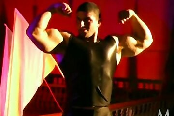 Very Muscular Leather Guy Flexing, Posing, and Jacking Off